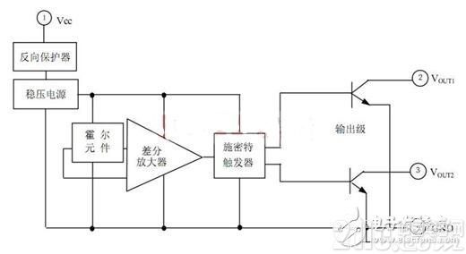 霍爾開關(guān)(Hall switch)又稱霍爾數(shù)字電路,是一種新型的電器配件,由反向電壓保護(hù)器、精密電壓調(diào)節(jié)器、霍爾電壓發(fā)生器、差分放大器、施密特觸發(fā)器、溫度補(bǔ)償器和互補(bǔ)型集電極開路輸出器等七部分組成,具有無觸點(diǎn)、低功耗、長使用壽命、響應(yīng)頻率高等特點(diǎn),內(nèi)部采用環(huán)氧樹脂封灌成一體化,能在各類惡劣環(huán)境下可靠的工作。該電路由于具有高達(dá)400 mA的負(fù)載能力,并且是互補(bǔ)型輸出,因此,它是無刷風(fēng)扇最理想的器件。