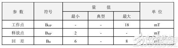 在外磁場的作用下,當(dāng)磁感應(yīng)強(qiáng)度超過導(dǎo)通閾值BOP 時(shí),霍爾電路輸出管導(dǎo)通,輸出低電平。之后B 再增加,電路仍保持導(dǎo)通態(tài)。若外加磁場的B 值降低到BRP 時(shí),輸出管截止,輸出高電平。我們稱BOP 為工作點(diǎn),BRP 為釋放點(diǎn),BOP-BRP=BH 稱為回差?;夭畹拇嬖谑归_關(guān)電路的抗干擾能力增強(qiáng)。