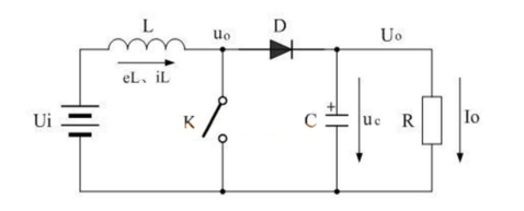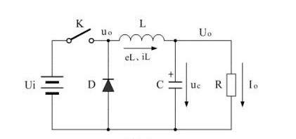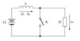 當(dāng)K接通時(shí),輸入電源開始對L加電,當(dāng)K關(guān)斷時(shí),反電動勢與電流方向相同,但是與開關(guān)關(guān)斷前的方向相反,控制開關(guān)倆端的輸出電源等于輸入電壓與反電動勢之和。