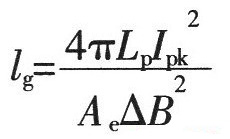 4、變壓器的氣隙lg如上式:Ae為磁芯的有效截面積(cm2),△B為磁芯工作磁感應(yīng)強(qiáng)度變化值(T),Lp單位取H,IPK單位取A,lg單位為mm。