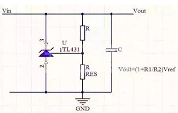(二)基準(zhǔn)電壓源芯片穩(wěn)壓電路是穩(wěn)壓電路的另一種形式,有些芯片對(duì)供電電壓要求比較高,例如AD DA芯片的基準(zhǔn)電壓等,這時(shí)常用的一些電壓基準(zhǔn)芯片如TL431、MC1403、REF02等。TL431是最常用基準(zhǔn)源芯片,有良好的熱穩(wěn)定性能的三端可調(diào)分流基準(zhǔn)電壓源。它的輸出電壓用兩個(gè)電阻就可以任意地設(shè)置到從Vref(2.5V)到36V范圍之間。常用電路應(yīng)用如下圖所示: