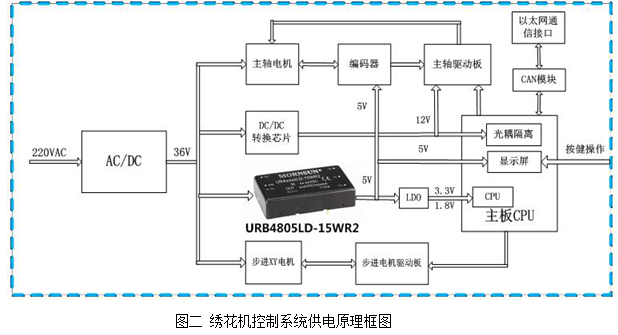 電腦繡花機控制系統(tǒng)由主控電路和外部設(shè)備構(gòu)成,DCDC電源模塊在繡花機控制系統(tǒng)中的應(yīng)用框圖如下所示: