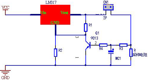 采樣電阻獲取限流信號(hào)保護(hù),如上圖是LM317限流保護(hù)電路,2P的連接器接負(fù)載,其中R是采樣電阻,一旦電流過大,電容MC1充電,充電大于達(dá)到三極管9013的導(dǎo)通電壓,LM317的輸出電壓降至它的基準(zhǔn)電壓之下,也可就是1.25V左右,從而保護(hù)負(fù)載。