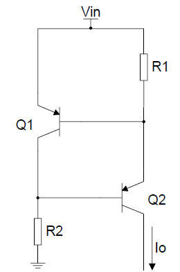 電路1:由兩個(gè)同型號(hào)的三極管,根據(jù)三極管Vbe電壓相對(duì)穩(wěn)定,以及三極管的基極電流相對(duì)集電極電流較小的特點(diǎn),組成一個(gè)電流相對(duì)恒定的恒流源,電流Io=Vbe/R1。這個(gè)恒流源沒(méi)有用到特殊器件,兩個(gè)三極管和兩個(gè)電阻組成,成本低,電流Io可調(diào)。缺點(diǎn)是Vbe的大小會(huì)隨電流及溫度的變化而變化,電流大Vbe大,溫度低Vbe大,所以不適合用在精度要求高的地方。