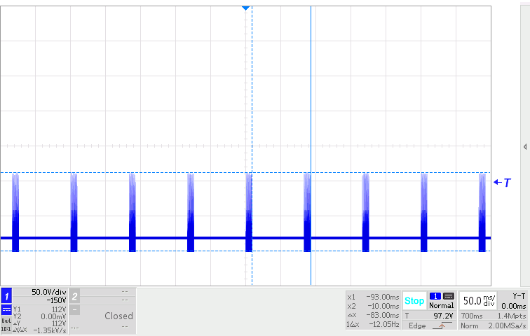 電路6:采用了恒流電路,測(cè)試的短路波形圖,用恒流電路替代電阻啟動(dòng)解決了啟動(dòng)和短路的矛盾。如下圖所示: