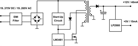 該要求為19至265VAC和19至375VDC的小功率反激式轉(zhuǎn)換器(在500mW的范圍內(nèi)),小功率反激式參考設(shè)計(jì)需要具備兩路輸出。一個(gè)輸出軌提供微控制器與模擬電路(電流為15mA時(shí)電壓為5.0V),另一個(gè)輸出軌則在電流為40mA時(shí)提供12V的電壓以控制繼電器。因?yàn)檩斎牒蛢陕份敵鲂枰?/span>2.5kV的隔離電壓,所以首先想到了結(jié)構(gòu)簡(jiǎn)單、廣為人知的反激式轉(zhuǎn)換器。