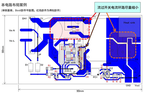 開關(guān)電源模塊利用開關(guān)的ON/OFF來控制電壓,但依然屬于模擬電路。雖然本身會發(fā)出高頻噪聲,但因擁有反饋環(huán)路,對噪聲非常敏感。也就是說,開關(guān)電源電路的路徑,必須考慮分成大電流ON/OFF后產(chǎn)生噪聲的路徑,以及對噪聲非常敏感的控制信號路徑?;迮渚€布局,大電流路徑應(yīng)避免產(chǎn)生噪聲,控制信號路徑應(yīng)避免受到噪聲影響。當(dāng)然,這種噪聲屬于輻射噪聲,也會對EMC造成影響,因此布局必須極力避免產(chǎn)生噪聲。